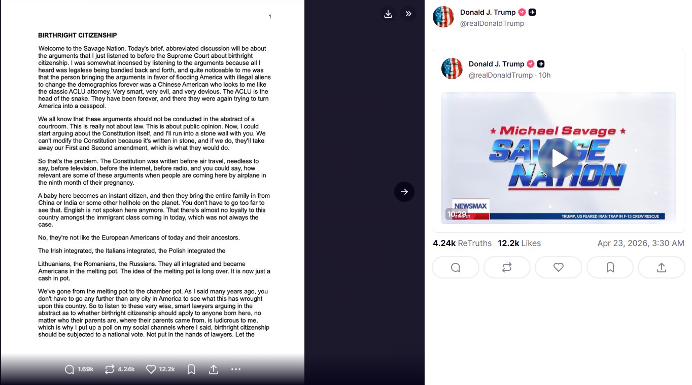 पत्र की शुरुआत में लिखा गया- “सैवेज नेशन में आपका स्वागत है। आज की छोटी, छोटी चर्चा उन दलीलों के बारे में होगी जो मैंने अभी सुप्रीम कोर्ट में बर्थराइट सिटिजनशिप के बारे में सुनीं। दलीलें सुनकर मुझे थोड़ा गुस्सा आया क्योंकि मैंने बस कानूनी बातें सुनीं जो आगे-पीछे हो रही थीं, और मुझे यह बात साफ़ तौर पर समझ आई कि अमेरिका में अवैध विदेशियों की बाढ़ लाने और डेमोग्राफिक्स को हमेशा के लिए बदलने के पक्ष में दलीलें देने वाला व्यक्ति एक चीनी अमेरिकी था जो मुझे क्लासिक ACLU वकील जैसा लगता है। बहुत चालाक, बहुत बुरा, और बहुत चालाक। ACLU साँप का सिर है। वे हमेशा से रहे हैं, और वे फिर से अमेरिका को एक गंदे पानी के गड्ढे में बदलने की कोशिश कर रहे थे।”