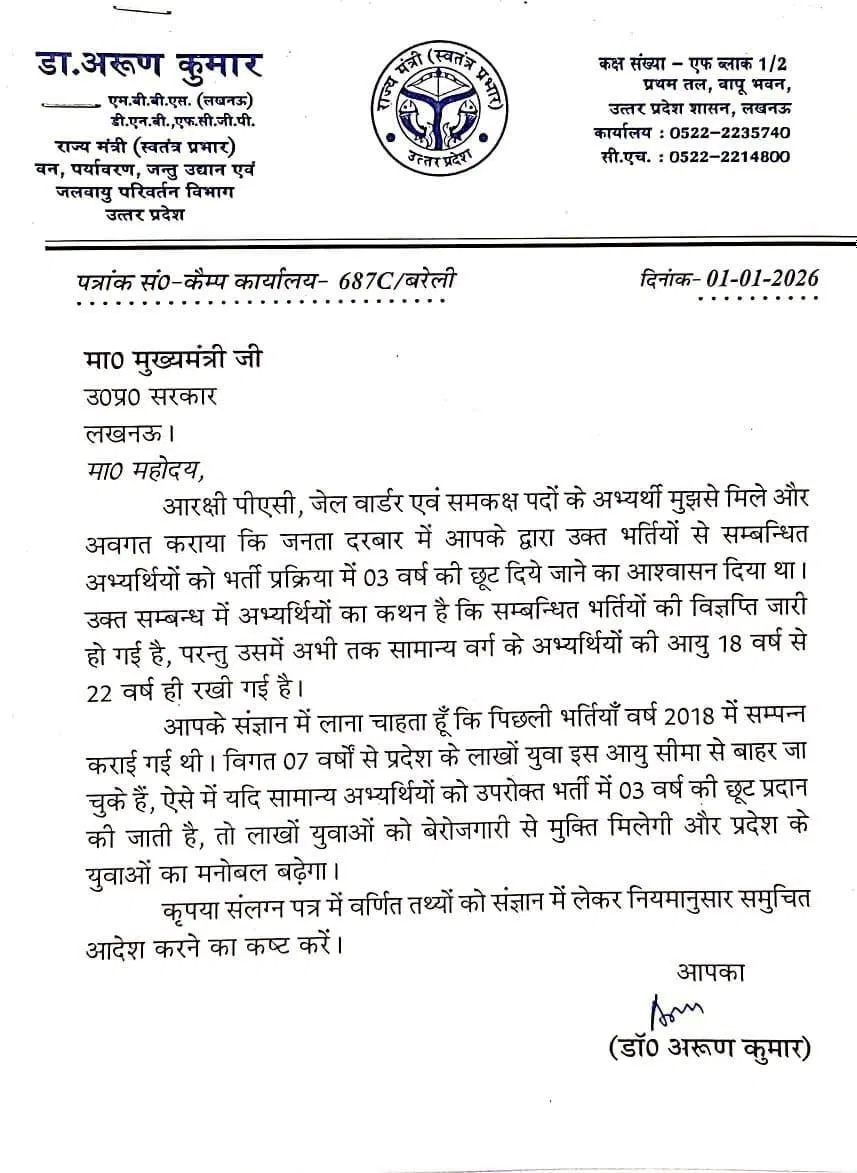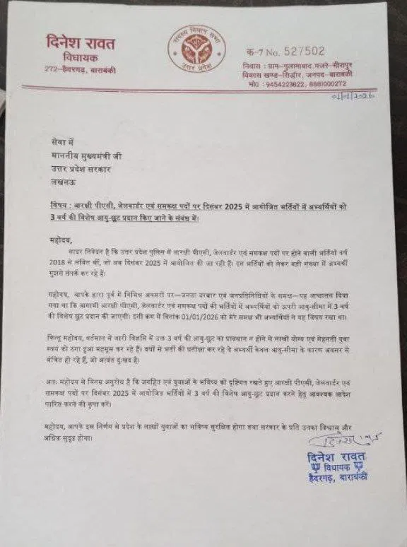 इस संबंध में राज्य मंत्री डॉ. अरुण कुमार (State Minister Dr. Arun Kumar), निषाद पार्टी के विधायक अनिल कुमार त्रिपाठी (Nishad Party MLA Anil Kumar Tripathi) और भाजपा के हैदरगढ़ से विधायक दिनेश रावत (BJP MLA Dinesh Rawat from Haidergarh) ने मुख्यमंत्री योगी आदित्यनाथ (Chief Minister Yogi Adityanath) को पत्र लिखा है। अनिल त्रिपाठी ने सीएम योगी को लिखे गए अपने पत्र में कहा कि इस प्रकरण में 18 नवंबर 2025 को गोरखपुर के जनता दरबार में आपने वादा किया था कि अभ्यर्थियों को तीन साल की छूट दी जाएगी पर भर्ती की विज्ञप्ति जारी होने के बाद छूट प्रदान नहीं की गई है। वहीं, प्रदेश सरकार में राज्यमंत्री डॉ. अरुण कुमार व भाजपा विधायक दिनेश रावत ने भी पत्र लिखकर अभ्यर्थियों को उम्र सीमा में छूट देने की मांग की है।