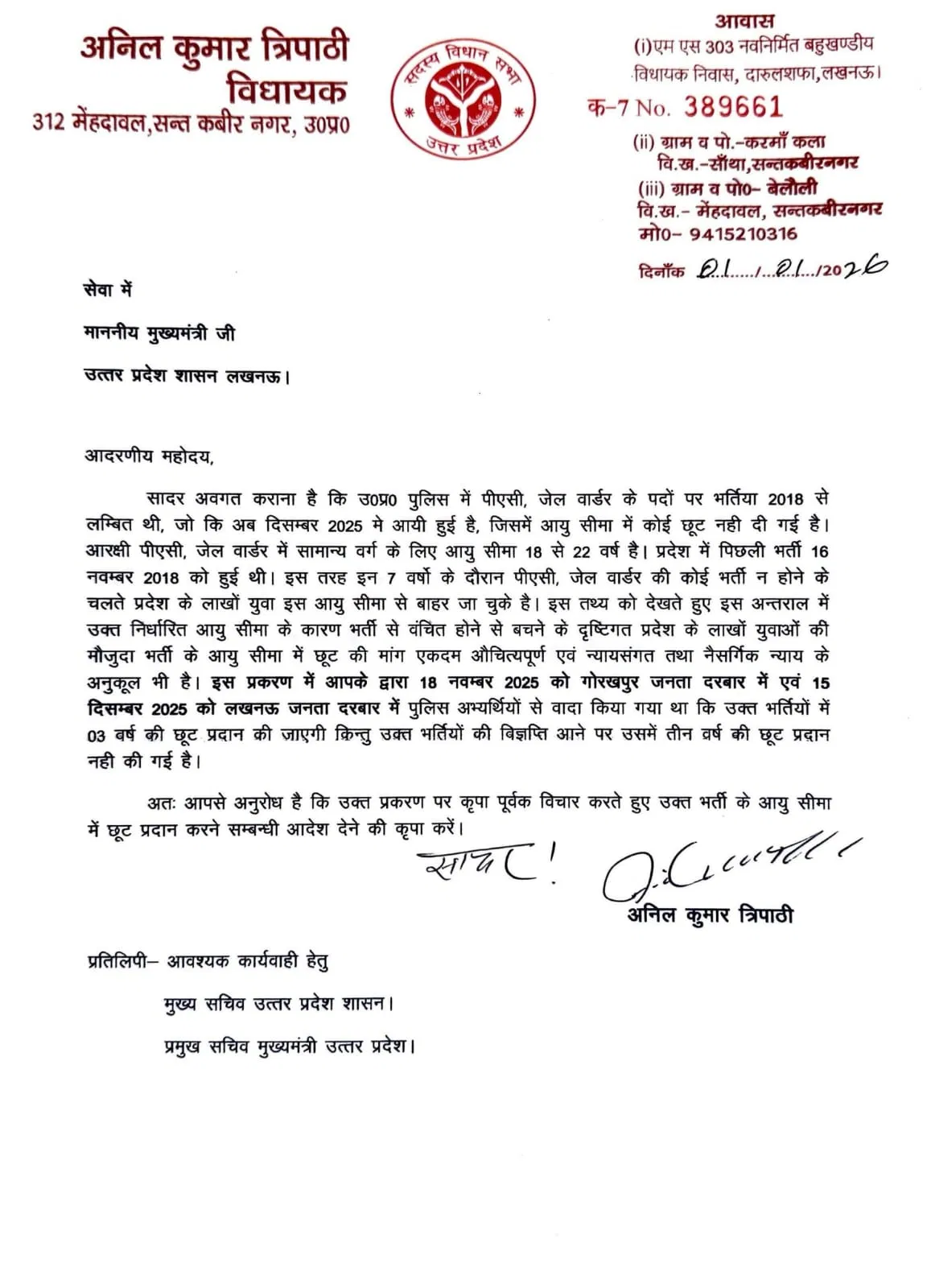 निषाद पार्टी के विधायक अनिल कुमार त्रिपाठी ने लिखा पत्र: