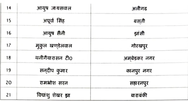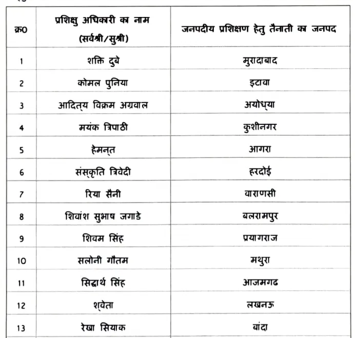 यूपी में 2025 बैच के 21 नए ट्रेनी आईएएस अधिकारियों को फील्ड में तैनाती मिलने जा रही है। ये सभी अधिकारी लाल बहादुर शास्त्री राष्ट्रीय प्रशासन अकादमी, मंसूरी से प्रशिक्षण प्राप्त कर प्रदेश की सेवा देंगे। कोर्स पूरा होने के बाद ये अधिकारी जिलों में असिस्टेंट मजिस्ट्रेट और असिस्टेंट कलेक्टर के पद पर काम करेंगे।