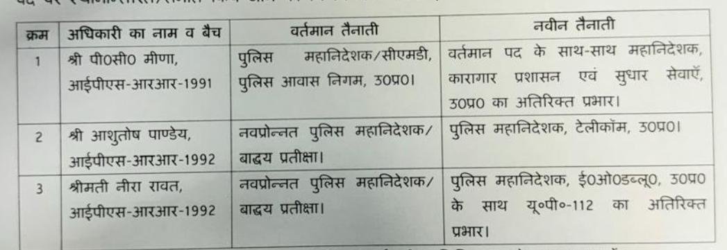 पीसी मीणा पुलिस आवास निगम के डीजी हैं। उन्हें वर्तमान जिम्मेदारी के साथ ही डीजी जेल का अतिरिक्त प्रभार दिया गया है। 1992 बैच की आईपीएस नीरा रावत को डीजी ईओडब्ल्यू के साथ डायल 112 का अतिरिक्त प्रभार भी मिला है। आशुतोष पांडेय गैर महत्वपूर्ण जिम्मेदारियों से इस बार भी बच नहीं पाए। उन्हें डीजी टेलीकॉम बनाया गया है।