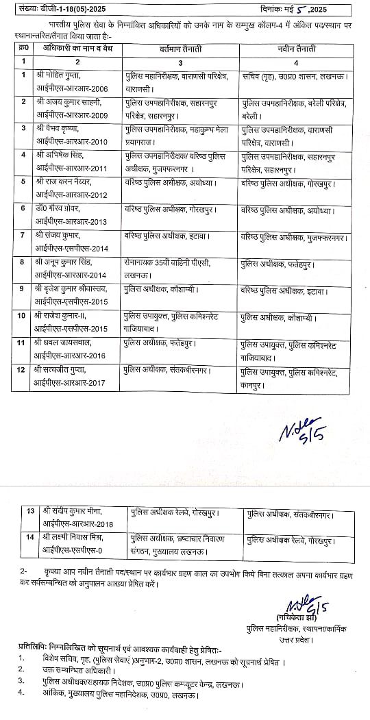 कौशांबी के पुलिस अधीक्षक बृजेश कुमार श्रीवास्तव को एसएसपी इटावा, गाजियाबाद में तैनात पुलिस उपायुक्त राजेश कुमार-द्वितीय को पुलिस अधीक्षक कौशांबी, फतेहपुर के एसपी धवल जायसवाल को गाजियाबाद में पुलिस उपायुक्त बनाया गया है। संतकबीरनगर के पुलिस अधीक्षक सत्यजीत गुप्ता को कानपुर पुलिस कमिश्नरेट में पुलिस उपायुक्त बनाया गया है। एसपी रेलवे गोरखपुर संदीप कुमार मीना को एसपी संतकबीरनगर और लखनऊ में तैनात लक्ष्मी निवास मिश्र को भ्रष्टाचार निवारण संगठन से एसपी रेलवे गोरखपुर बनाया गया है। पीएसी 35वीं वाहिनी लखनऊ में तैनात सेनानायक अनूप कुमार सिंह को एसपी फतेहपुर बनाया गया है।