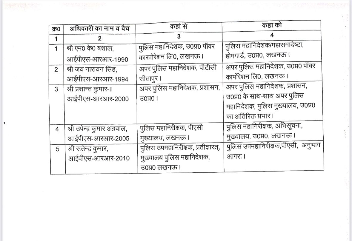 लखनऊ। यूपी की योगी सरकार (Yogi Government) ने मंगलवार को पांच आईपीएस अधिकारियों की जिम्मेदारियों में बदलाव किया है। आईपीएस एम के बशाल को डीजी पावर कॉरपोरेशन लिमिटेड से डीजी होमगार्ड,आईपीएस जय नारायण सिंह ADG पीटीसी सीतापुर से अब ADG पावर कॉरपोरेशन की ज़िम्मेदारी व प्रशांत कुमार -2 ADG प्रशासन के साथ साथ ADG मुख्यालय का भी चार्ज संभालेंगे।