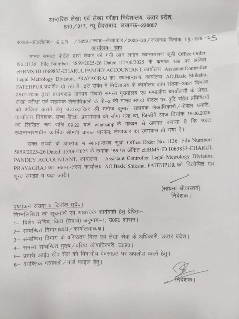 लखनऊ। यूपी के बेसिक शिक्षा विभाग (Basic Education Department) से एक हैरान कर देने वाली घटना सामने आई है, जहां दो साल पहले मृत हो चुकी एक कर्मचारी का ट्रांसफर फतेहपुर कर दिया गया है। उत्तर प्रदेश के आंतरिक लेखा एवं लेखा परीक्षा निदेशालय (Directorate of Internal Accounts and Audit of Uttar Pradesh) की बड़ी लापरवाही सामने आई है। निदेशालय ने 15 जून 2025 को जारी एक आदेश में दिवंगत चारुल पांडेय (Charul Pandey) का ट्रांसफर प्रयागराज से फतेहपुर कर दिया। आदेश संख्या 5859/2025-26 के तहत इसे जारी किया गया था। जिसमें स्पष्ट रूप से चारुल पांडेय (Charul Pandey) को फतेहपुर बेसिक शिक्षा कार्यालय (Fatehpur Basic Education Office) में तैनाती दी गई है।