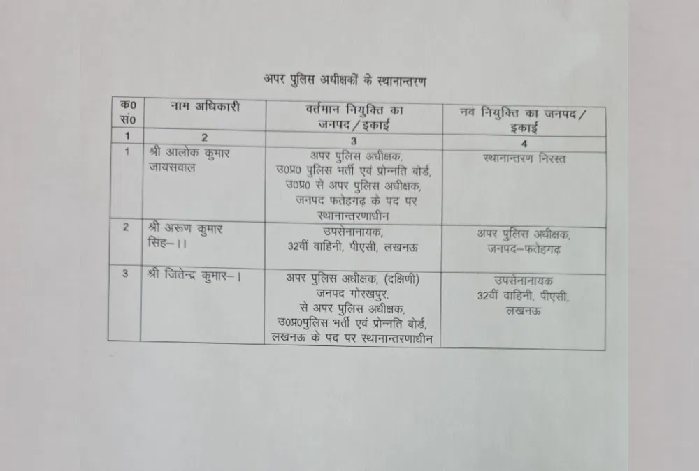 यूपी की योगी सरकार ने मंगलवार को तीन अपर पुलिस अधीक्षकों के तबादले कर दिया है। हालांकि, आलोक कुमार जायसवाल का स्थानांतरण निरस्त कर दिया गया। वो अभी उत्तर प्रदेश पुलिस भर्ती एवं प्रोन्नति बोर्ड में तैनात हैं। अरुण कुमार सिंह का स्थानांतरण फतेहगढ़ कर दिया गया है।