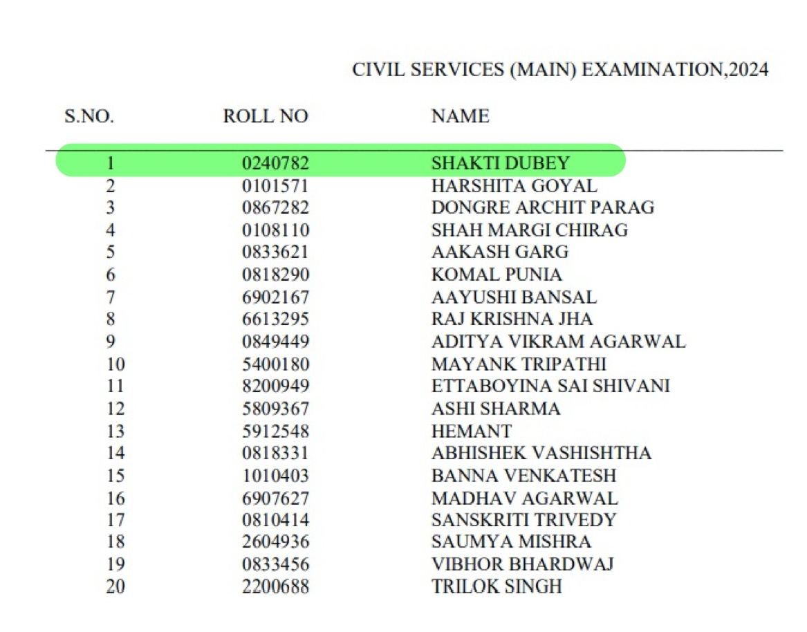नई दिल्ली। संघ लोक सेवा आयोग (UPSC) ने यूपीएससी सिविल सेवा अंतिम परीक्षा परिणाम 2024 (UPSC Civil Services Final Exam Result 2024) घोषित कर दिया है। परिणाम upsc.gov.in पर जारी हो चुका है। प्रयागराज की शक्ति दुबे (Shakti Dubey) ने यूपीएससी सिविल सेवा अंतिम परीक्षा 2024 में टॉप (UPSC Civil Services Final Exam Result 2024) किया है। वहीं, हर्षिता गोयल दूसरे स्थान पर हैं। तीसरे स्थान पर डोंगरे अर्चित पराग रहे हैं।