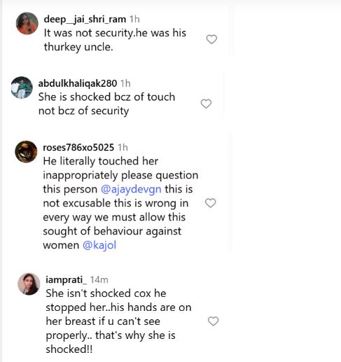 वायरल वीडियो पर एक फैन ने लिखा कि ‘ये सिक्योरिटी नहीं है, बल्कि ठरकी अंकल है।’ दूसरे फैन ने कमेंट किया कि ‘वो टच की वजह से हैरान रह गई, सिक्योरिटी की वजह से नहीं।’ एक और शख्स ने कहा कि ‘उन्होंने सचमुच उन्हें गलत तरीके से छुआ है। प्लीज इस व्यक्ति से सवाल करें अजय देवगन। ये माफी के काबिल नहीं है, ये हर तरह से गलत है, हमें औरतों के खिलाफ इस तरह के बर्ताव की इजाजत नहीं देनी चाहिए काजोल।