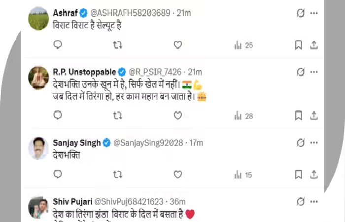 कोहली का देश के प्रति प्रेम और सम्मान देखने के बाद फैंस भी कमेंट सेक्शन में अपनी हीरो की जमकर तारीफ कर रहे हैं। एक यूजर ने लिखा कि देश का तिरंगा झंडा विराट के दिल में बसता है। दूसरे यूजर ने कहा कि देशभक्ति उनके खून में है, सिर्फ खेल में नहीं। जब दिल में तिरंगा हो, हर काम महान बन जाता है। एक अन्य यूजर ने लिखा कि विराट, विराट है उन्हें सैल्यूट है!