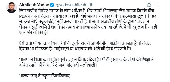 समाजवादी पार्टी के राष्ट्रीय अध्यक्ष अखिलेश यादव (Samajwadi Party National President Akhilesh Yadav) ने एक्स पोस्ट पर वीडियो शेयर कर लिखा कि जिन गांवों में पीडीए समाज के लोग अधिक हैं और उनमें भी मल्लाह जैसे समाज जिनके बीच PDA की नयी चेतना का प्रसार हो रहा है। वहां भाजपा सरकार पीडीए पाठशाला खुलने के डर से, अब सीधे ‘स्कूल बंदी’ नहीं करवा पा रही है तो सत्ता-सजातीय लोगों के द्वारा ‘टीचर’ न भेजकर झूठी हाज़िरी लगाने का दबाव प्रधानाध्यापकों पर बनवा रही है, ये भी स्कूल बंदी का ही एक और तरीक़ा है।
