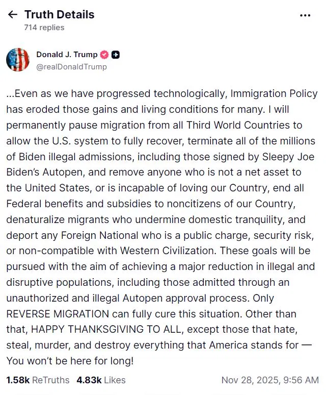 सोशल मीडिया प्लेटफॉर्म ट्रुथ सोशल (Social Media Platform Truth Social) पर पोस्ट करते हुए ट्रंप ने कहा, अमेरिका जरूरत पड़ने पर उन प्रवासियों को देश से बाहर करेगा जो अपराध करते हैं या देश के लिए बोझ बनते हैं। अवैध रूप से घुसे लोगों के सभी रिकॉर्ड रद्द किए जाएंगे। ऐसे सभी प्रवासियों की नागरिकता हटाई जाएगी जो अमेरिका की शांति और कानून व्यवस्था को नुकसान पहुंचाते हैं। गैर-अमेरिकियों को मिलने वाले सरकारी लाभ और सब्सिडी बंद करने की भी बात कही। ट्रंप ने अपने संदेश में कहा कि अमेरिका में रह रहे ‘गैरकानूनी और असामाजिक समूहों’ के चलते देश में अपराध, बेरोजगारी और सामाजिक असंतुलन बढ़ रहा है।