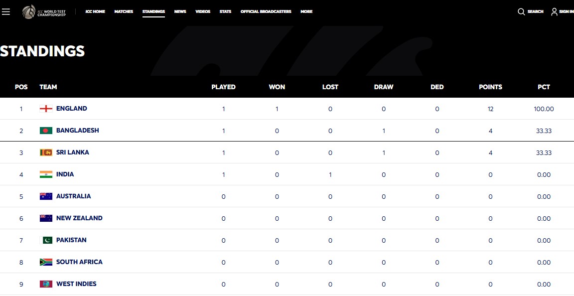 इंग्लैंड के बाद दूसरे नंबर पर बांग्लादेश है, जिसने श्रीलंका के खिलाफ इस चक्र का पहला मैच ड्रॉ करवाया था। बांग्लादेश 4 पॉइंट्स और 33 जीत प्रतिशत अंकों के साथ दूसरे पायदान पर है। इसके बाद तीसरे पायदान पर श्रीलंका है, जिसके पास बांग्लादेश जितने ही पॉइंट्स और जीत प्रतिशत अंक हैं। वहीं, भारत चौथे पायदान पर है, जिसका अभी तक खाता भी नहीं खुला है। बाकी अन्य देशों ने अपने अभियान की शुरुआत नहीं की है।