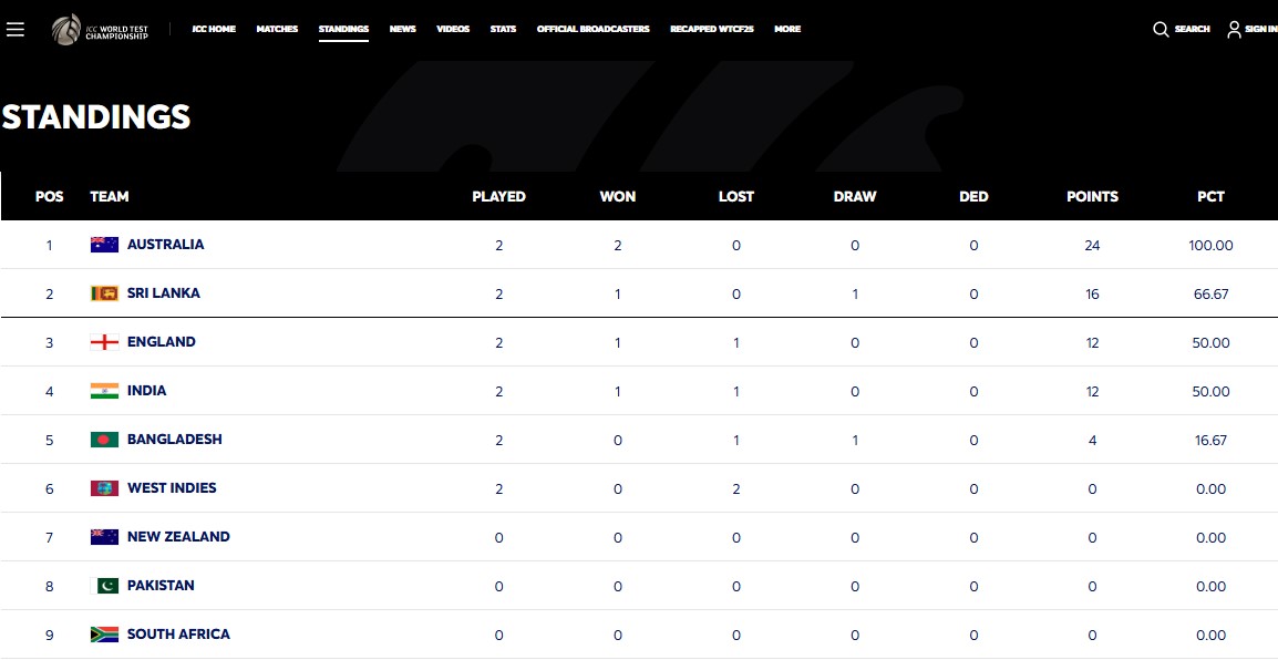 वर्ल्ड टेस्ट चैंपियनशिप 2025-27 चक्र के स्टैंडिंग्स के अनुसार, ऑस्ट्रेलिया दो मैचों में दो जीत के बाद 24 पॉइंट्स और 100 जीत प्रतिशत अंक के साथ पहले पायदान पर है। इसके बाद दूसरे पायदान पर श्रीलंका है, जिसने दो मैच में एक जीत एक ड्रॉ के 16 अंक हासिल किए हैं और उसके 66.67 जीत प्रतिशत अंक है। तीसरे पायदान पर इंग्लैंड और चौथे पायदान पर भारत है। जिनके दो मैच में एक हार और एक जीत के बाद 12 पॉइंट्स हैं, दोनों के 50 जीत प्रतिशत अंक हैं।