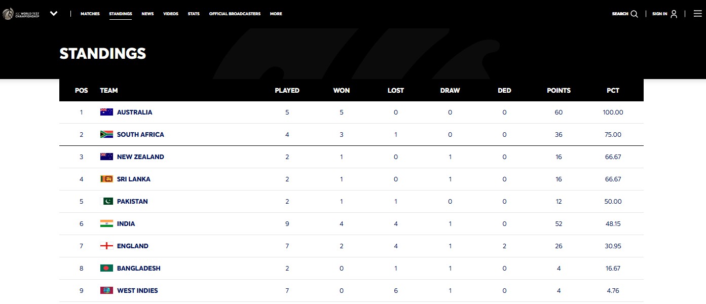 दूसरी तरफ, न्यूजीलैंड के तीसरे पायदान पर काबिज होने से भारत को नुकसान हुआ है। टीम अब पांचवें से छठे पायदान पर खिंसक गयी है। उससे नीचे क्रमशः इंग्लैंड, बांग्लादेश और वेस्ट इंडीज की टीमें हैं। भारत ने अभी तक मौजूदा चक्र में कुल 9 मैच खेले हैं, जिसमें से चार में जीत और चार हार शामिल हैं। टीम का पीसीटी 48.15 है।
