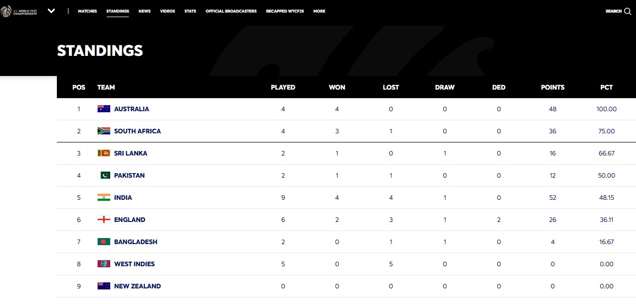 डब्ल्यूटीसी 2025-27 चक्र के पॉइंट्स टेबल का ताजा हाल