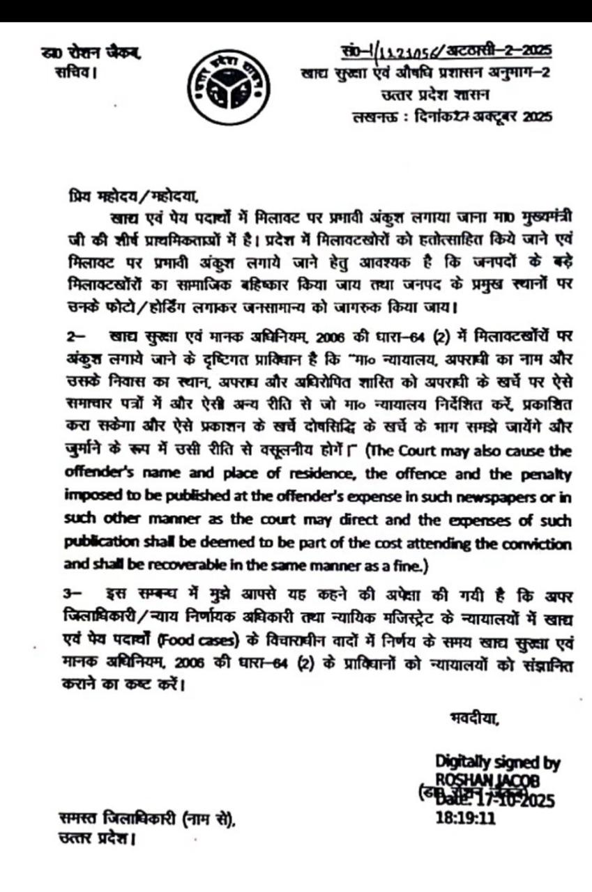 डॉ. रोशन जैकब (Dr. Roshan Jacob) कहा कि इस सम्बन्ध में मुझे आफ्से यह कहने की अपेक्षा की गयी है कि अपर जिलाधिकारी/न्याय निर्णायक अधिकारी तथा न्यायिक मजिस्ट्रेट के न्यायालयों में खाद्य एवं पेय पदार्थों (Food cases) के विचाराधीन वादों में निर्णय के समय खाद्य सुरक्षा एवं मानक अधिनियम, 2006 की धारा-64 (2) के प्राविधानों को न्यायालयों को संझानित कराने का कष्ट करें।