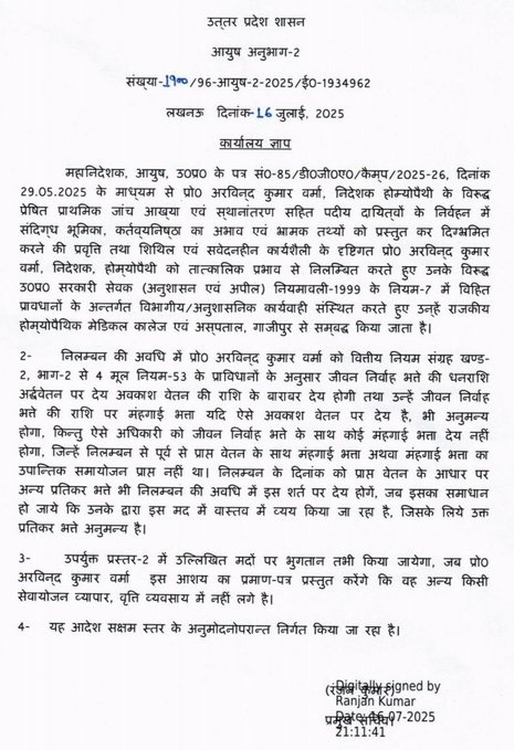 उत्तर प्रदेश की योगी सरकार के आयुष मंत्री डॉ. दयाशंकर मिश्र 'दयालु' ने बड़ी कार्रवाई की है। उन्होंने निदेशक होम्योपैथी प्रो. अरविंद कुमार वर्मा को सस्पेंड कर दिया है। अरिवंद वर्मा ट्रांसफर-पोस्टिंग में हुई अनियमिताओं को लेकर विवादों में घिरे हुए थे। उधर, आयुष मंत्री ने अरविंद वर्मा के किए गए ट्रांसफर को भी निरस्त कर दिया था और जांच के आदेश दिए थे।